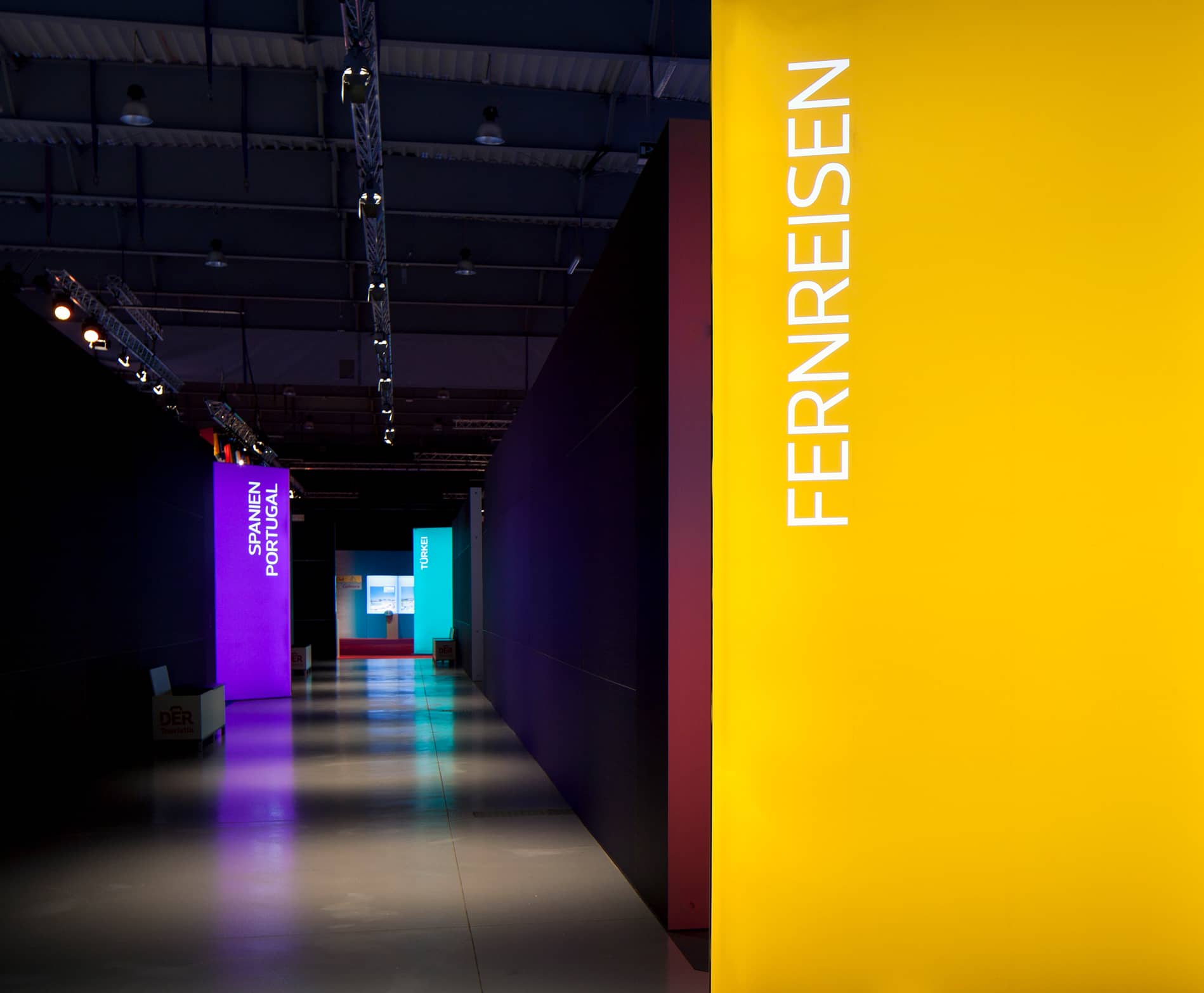 At the DER Touristik trade fair, providers and service providers can present their offerings for the coming year to travel agency employees. Our optimised concept is based on experience gained from two previous concepts, each of which was implemented over several years. The B2B trade fair concept guides visitors from one holiday world to the next using a digital travel guide (iPad): surrounded by large, bright images that evoke emotions and wanderlust, visitors will find exhibitors alongside themed buffets, performances and presentations.