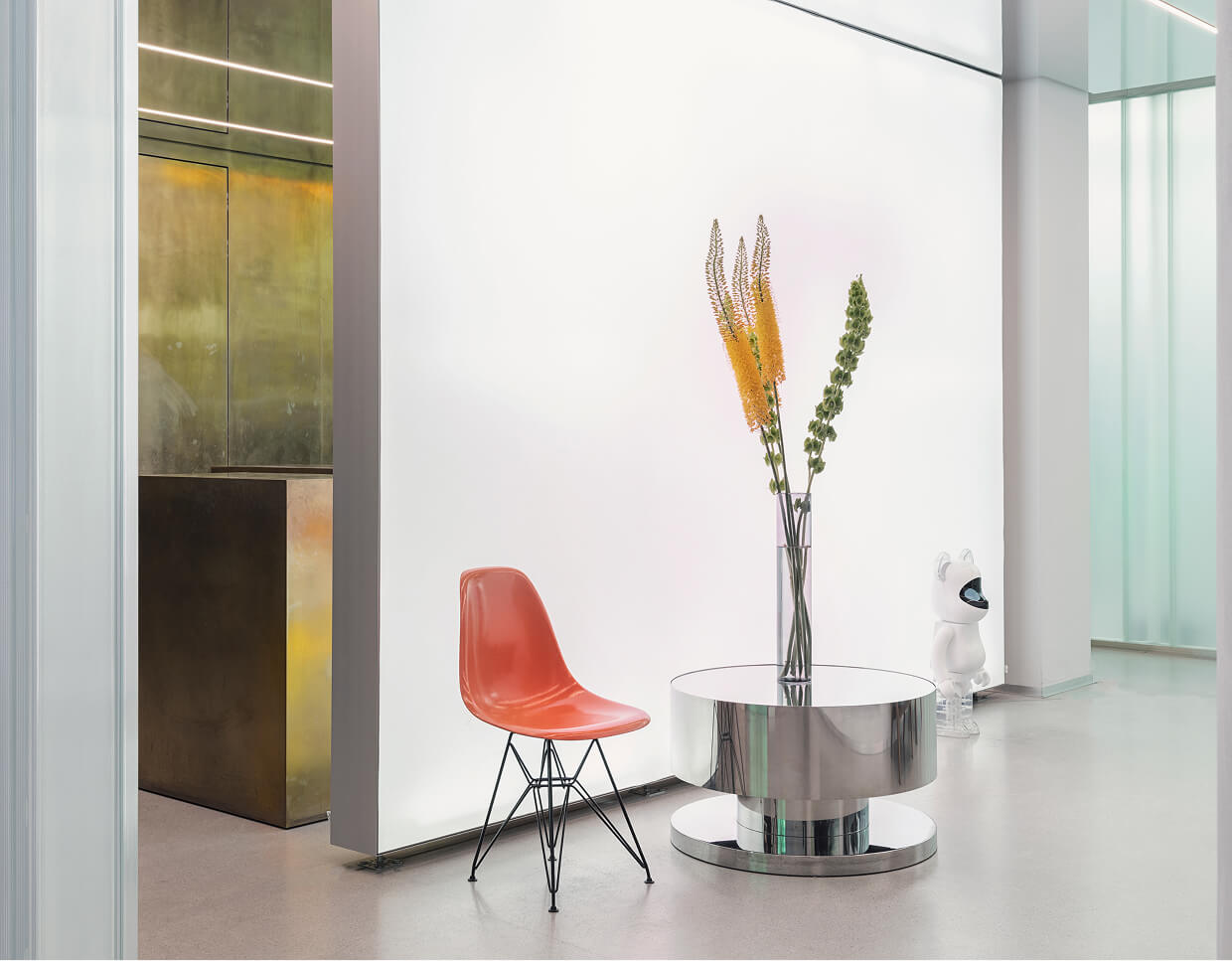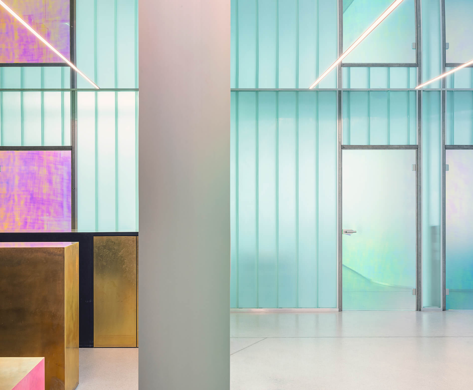 Instead of a conventional reception desk, standing counters create a more accessible atmosphere. The mirrored ceiling above – embedded with linear light elements – expands the space, multiplies movement, and turns light into architecture. Throughout the practice, translucent industrial glass panels allow natural daylight to flow deep into the interior. Glass doors subtly shift color depending on movement and angle