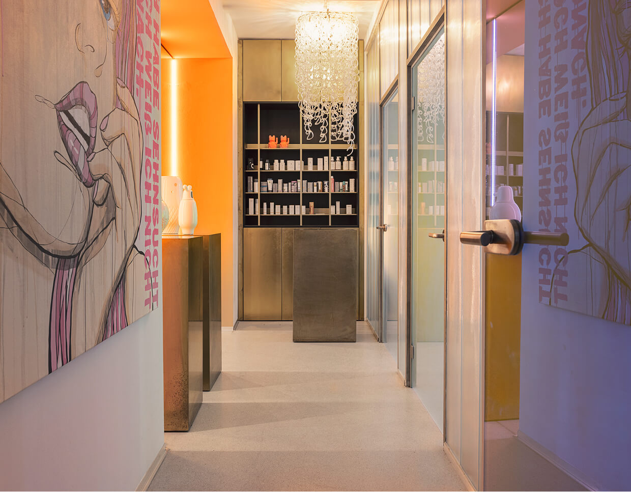 The centerpiece is a large light wall featuring a pink AT-AT – a pop-cultural icon recontextualized in a medical setting. It surprises, provokes, and captures attention. More than decoration, it signals the core idea of this space: beauty doesn’t need to conform – it can be expressive, ironic, and intelligent.