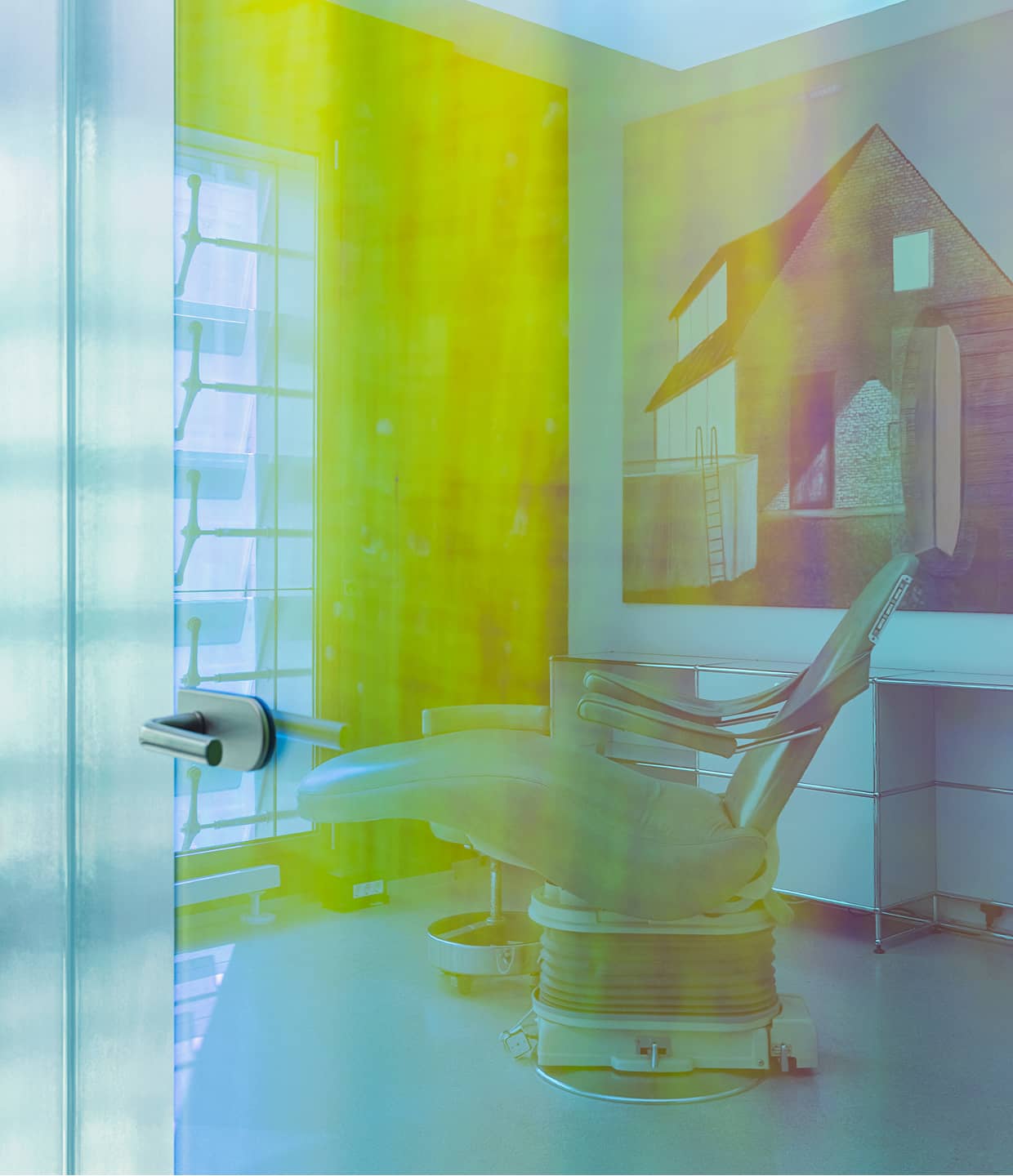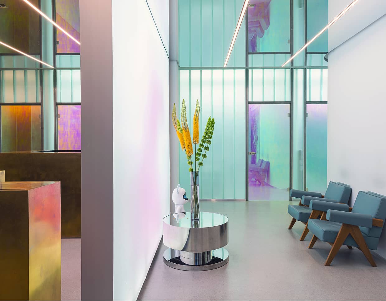 Instead of a conventional reception desk, standing counters create a more accessible atmosphere. The mirrored ceiling above – embedded with linear light elements – expands the space, multiplies movement, and turns light into architecture. Throughout the practice, translucent industrial glass panels allow natural daylight to flow deep into the interior. Glass doors subtly shift color depending on movement and angle