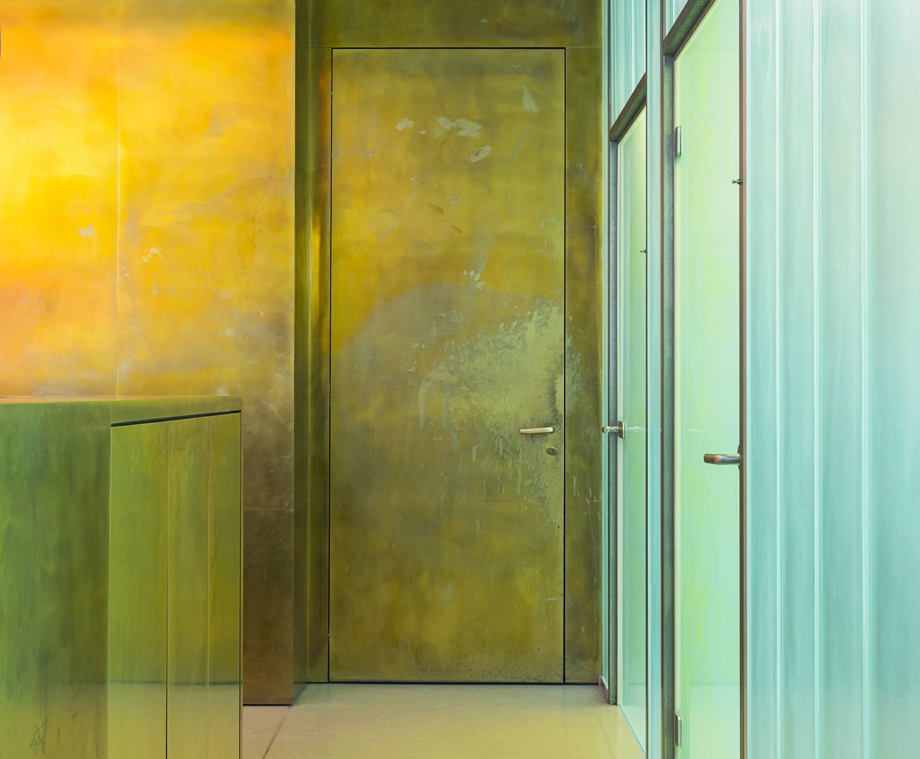 Facing it: a 10-meter-long wall of real brass, with integrated doors and architectural precision. It serves as a counterbalance to the pop-art energy – grounding the space in material honesty and craftsmanship. The brass isn’t just aesthetic; it’s a declaration of authenticity.