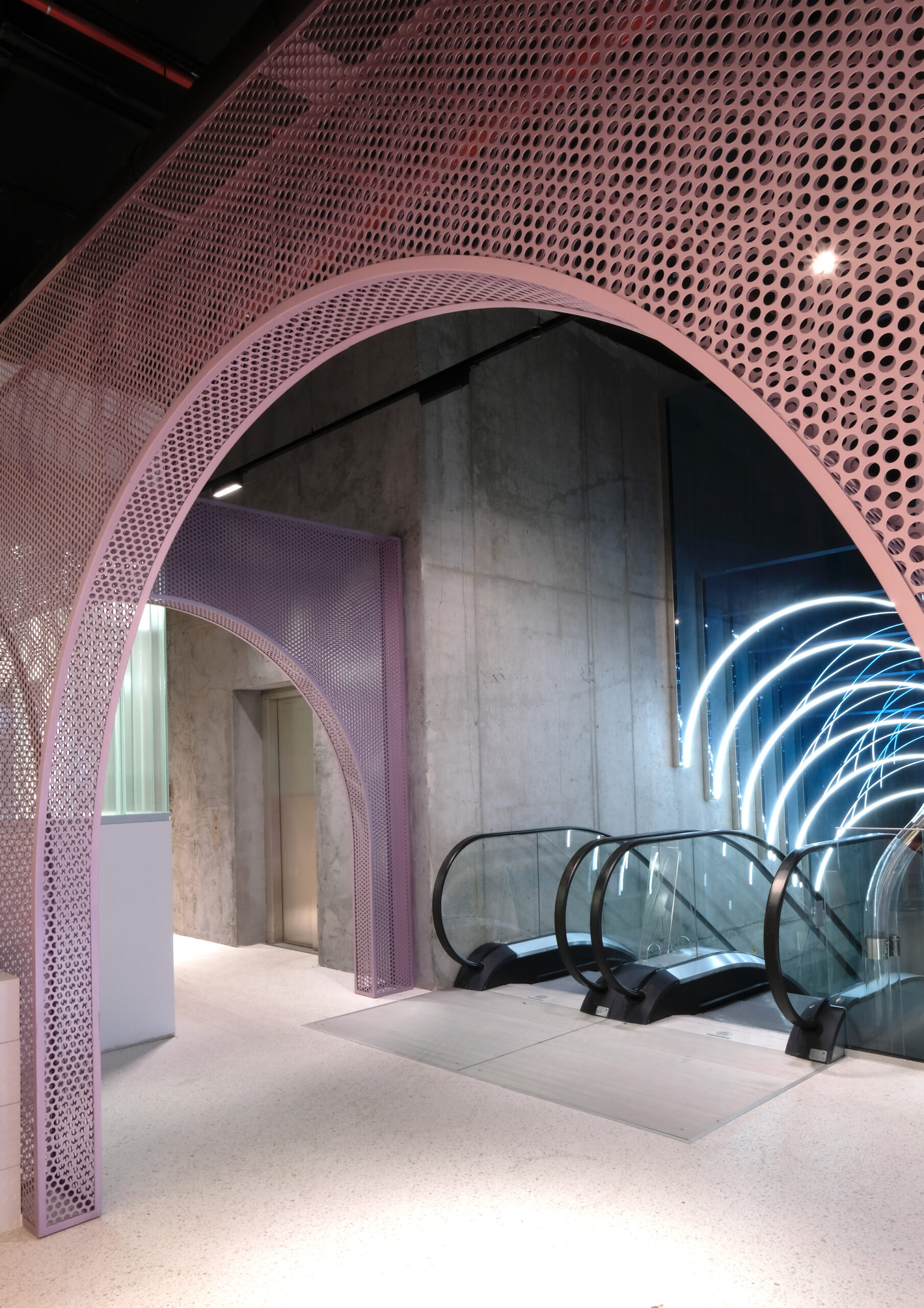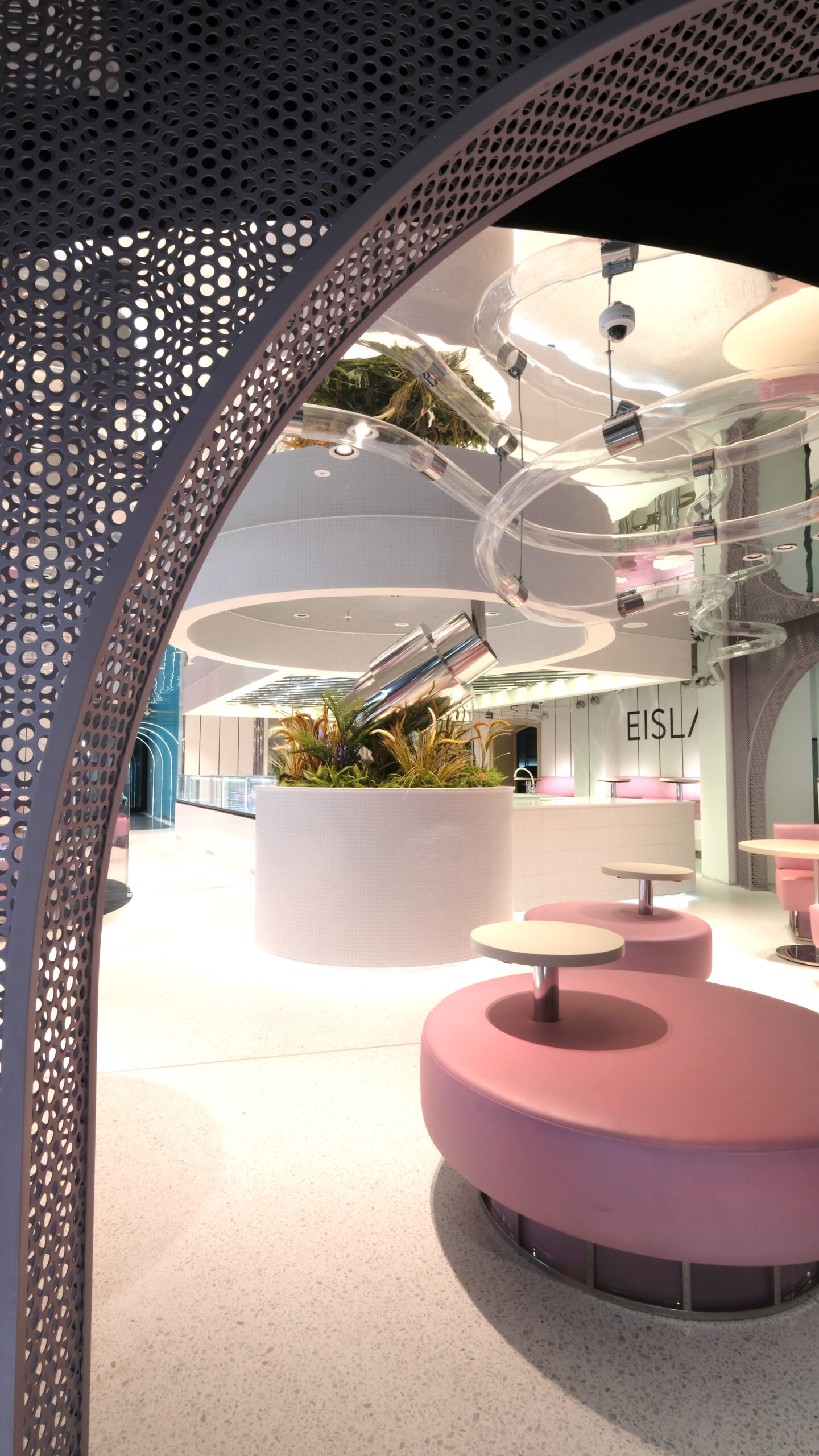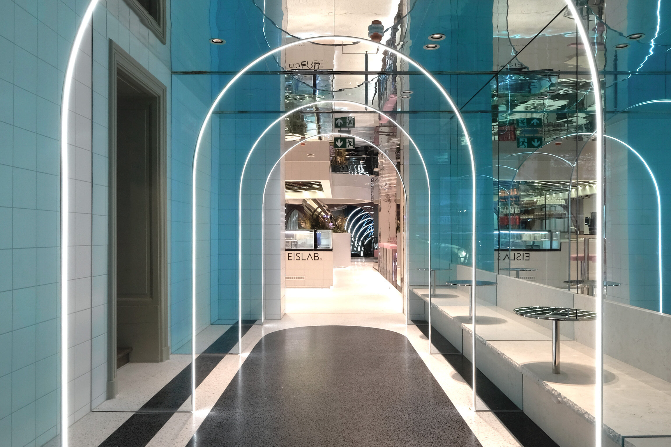 Visitors enter through a tunnel of glowing arches that create a cinematic sense of arrival. Inside, curated seating areas echo the familiarity of classic ice cream parlors – but refined through a minimalist lens. The space is equally made for community, pause, and storytelling.