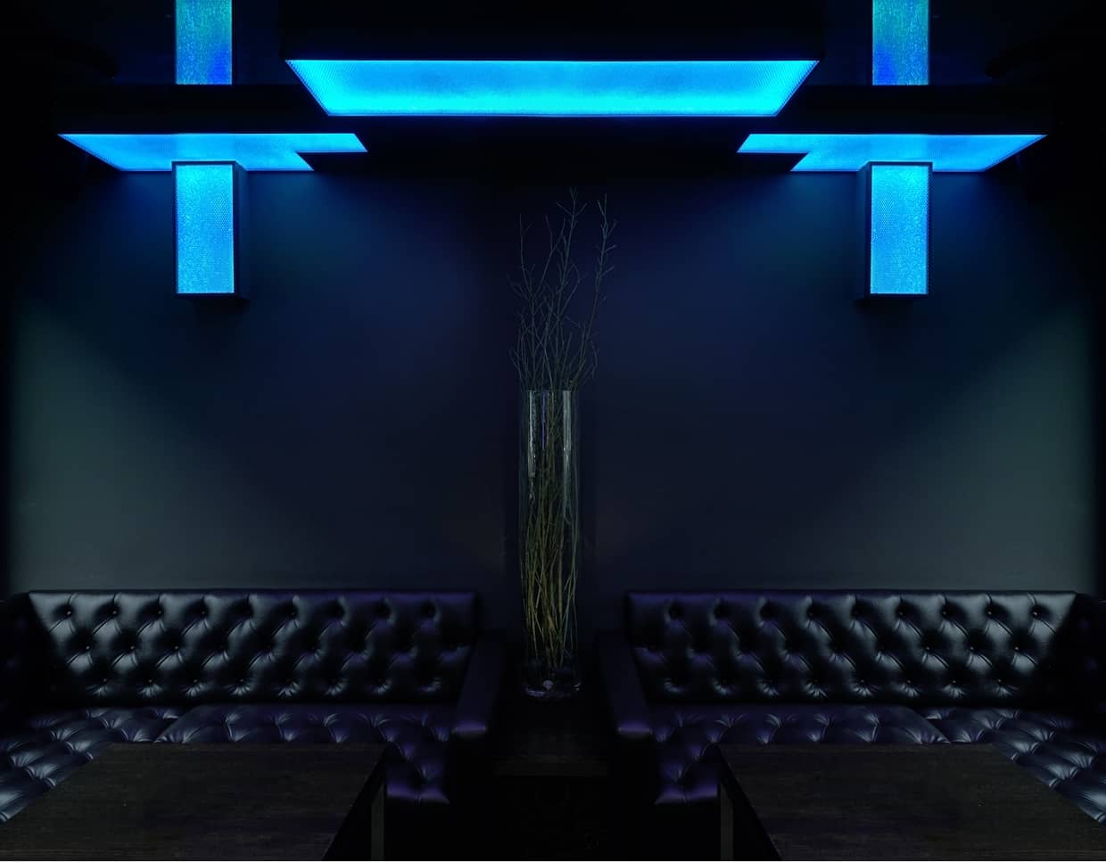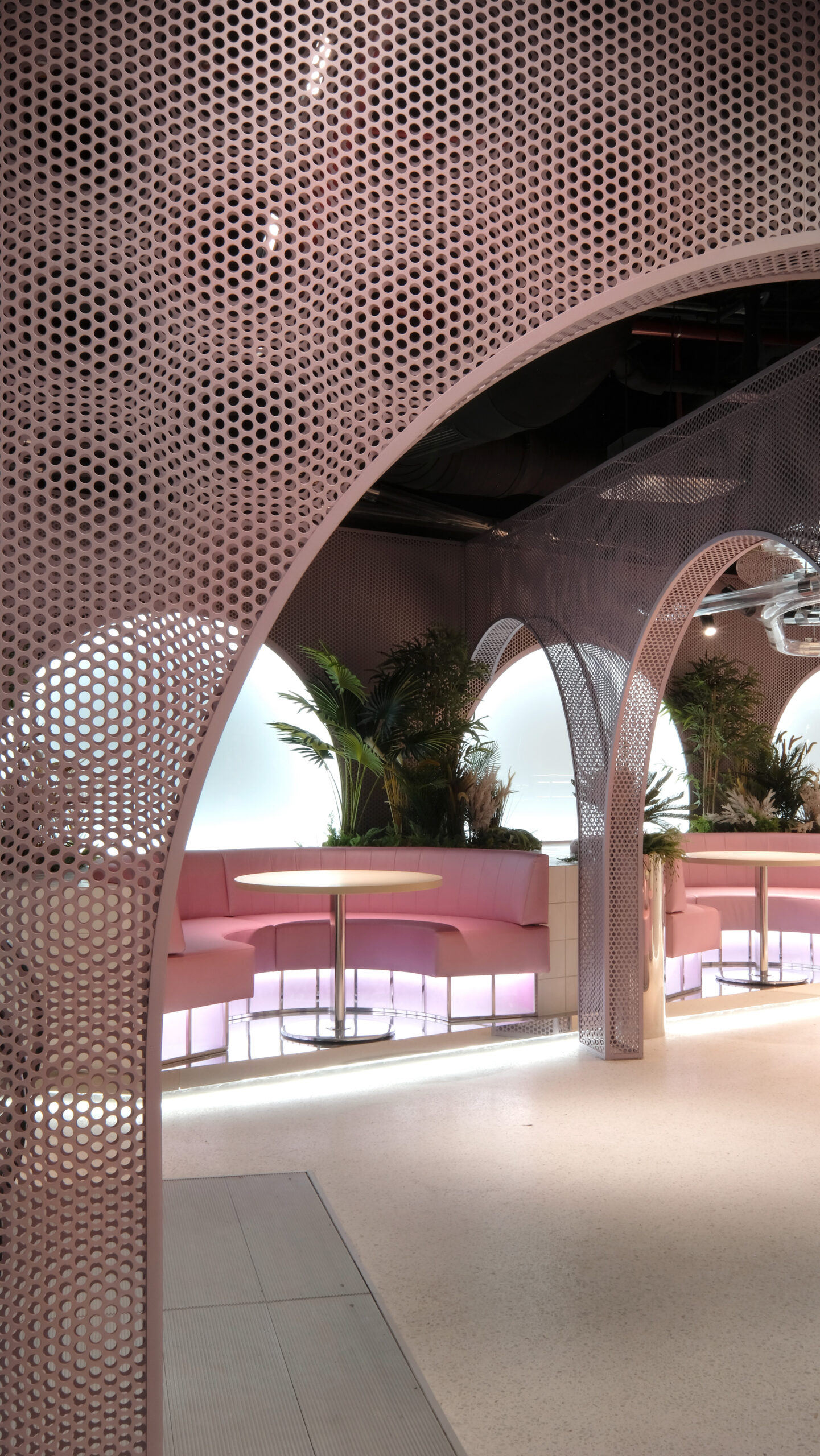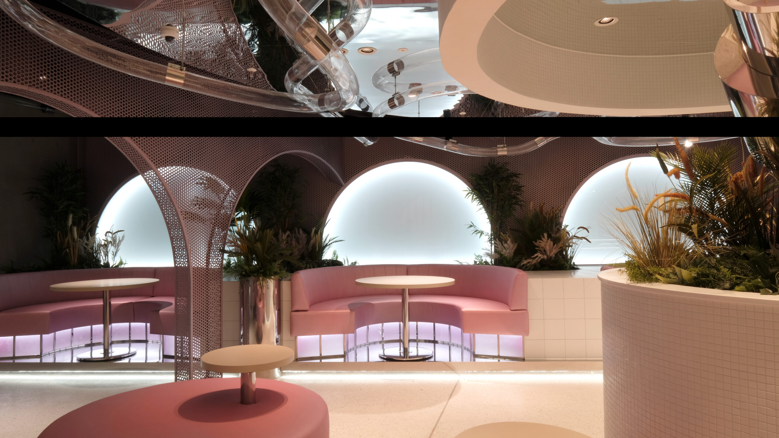Suspended across a fully mirrored ceiling, a real, functioning pneumatic tube system twists and loops through the space like a glowing organism. Transparent tubes reveal pink-lit capsules rushing above the guests – playful, unexpected, and visually magnetic. A nod to retro-futurism and kinetic art.
