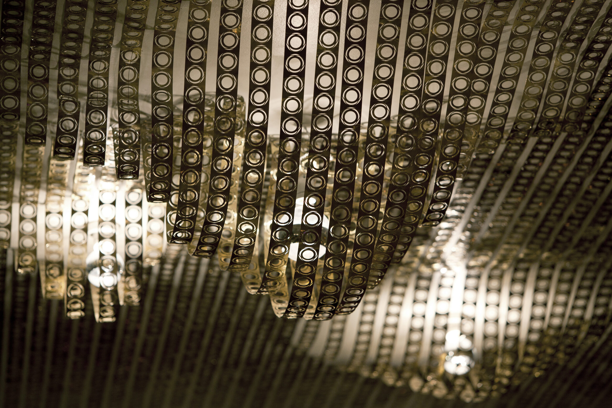 At the center: a golden palm tree, crafted from reclaimed pallet leaves – sculptural, tongue-in-cheek, and unmistakable. Above it floats a ceiling piece made from industrial brass cut-offs – originally waste from lamp manufacturing. Here, reimagined into an elegant light feature that blends raw material with graphic clarity.