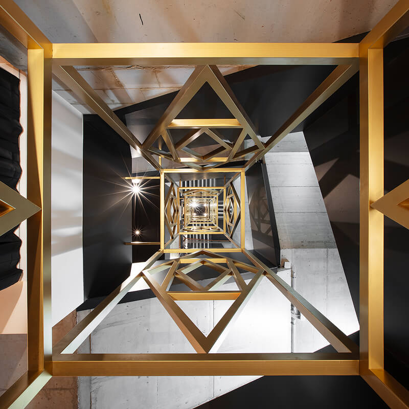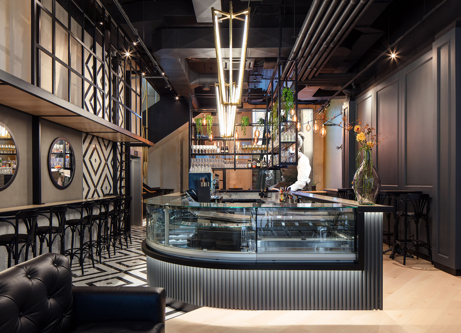 Mondenero brings together gastronomy and retail with services. At the heart of the store is an elegant café with a spacious bar, where the latest fashions from the Mondenero label are also presented. The café on the ground floor is connected to the first floor through a sculptural element in the staircase, combining “masculine” steel with “feminine” gold, and clear structures with delicate patterns.