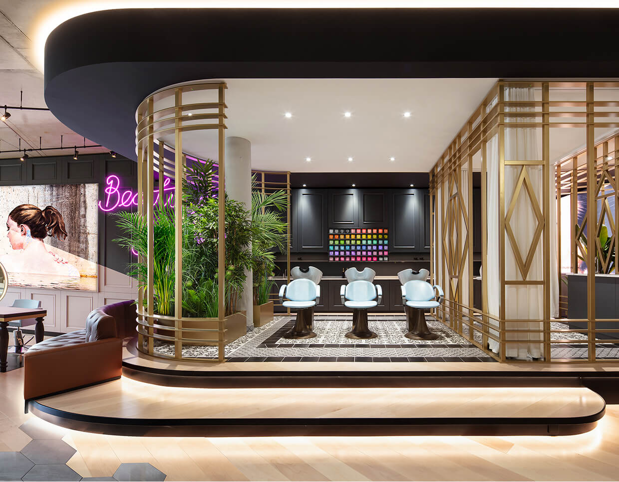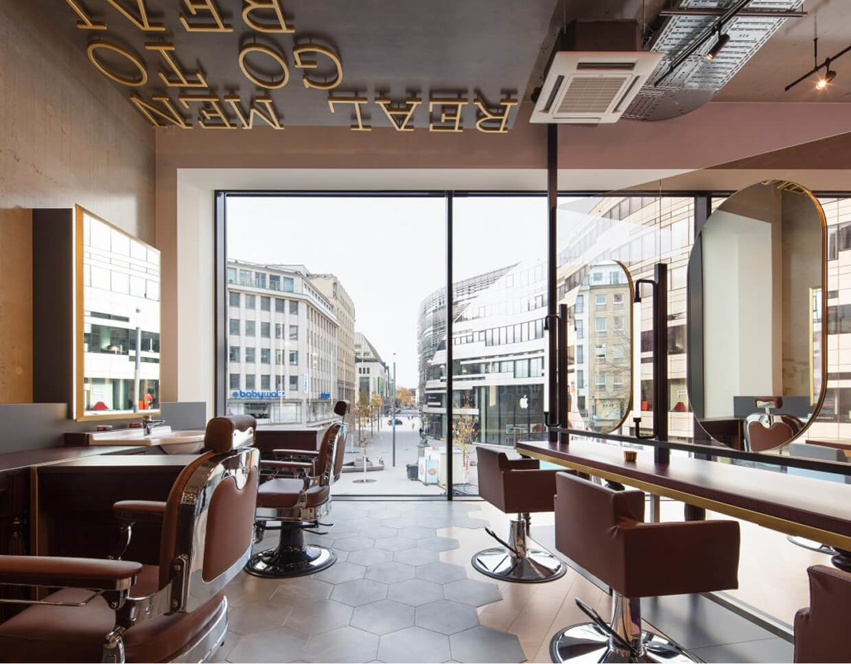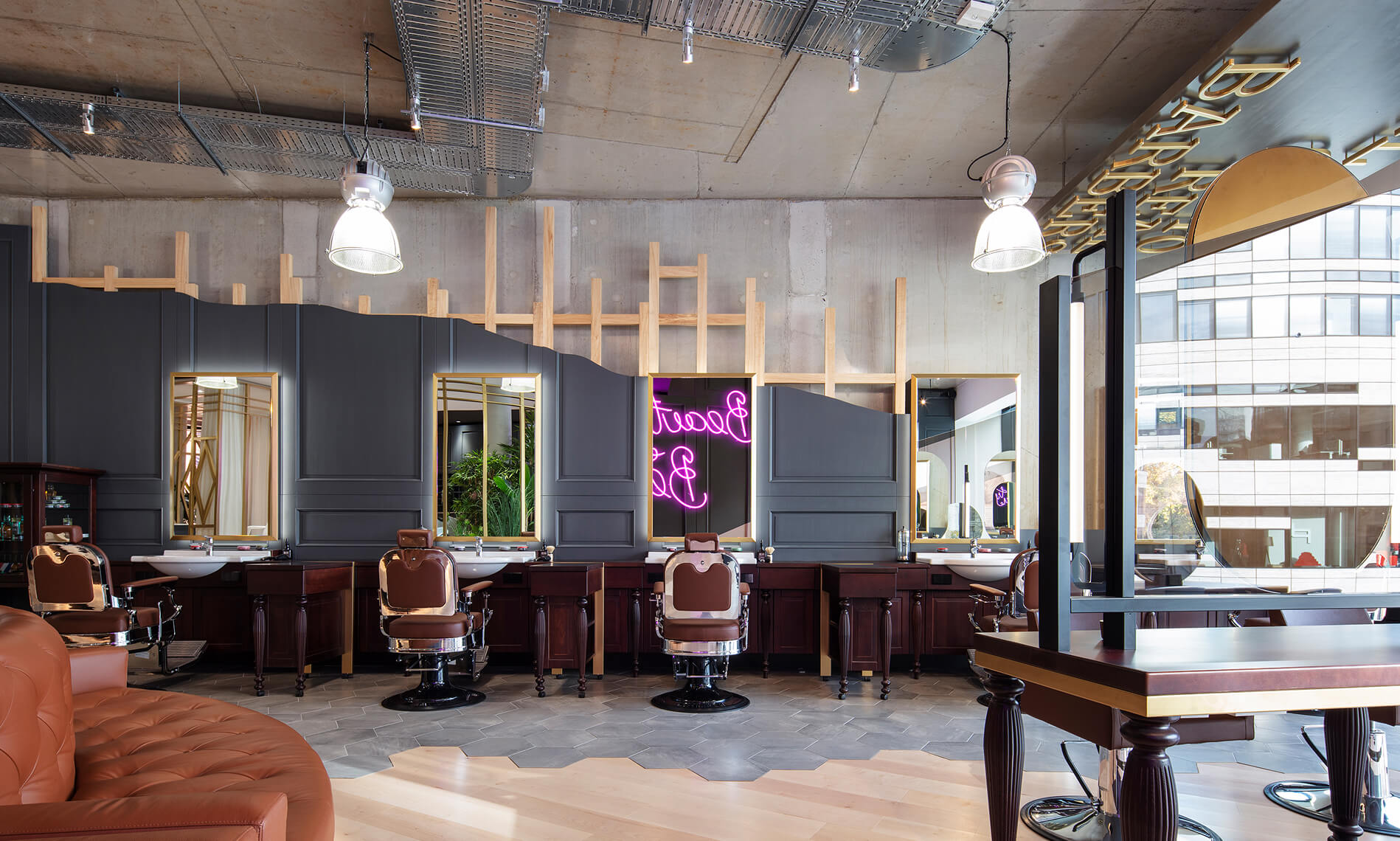 The design of the barbershop on the first floor also plays with characteristic design elements culturally perceived as masculine and feminine: a predominantly masculine atmosphere – raw construction, exposed concrete, wood, leather, and steel – is complemented by subtle feminine touches.