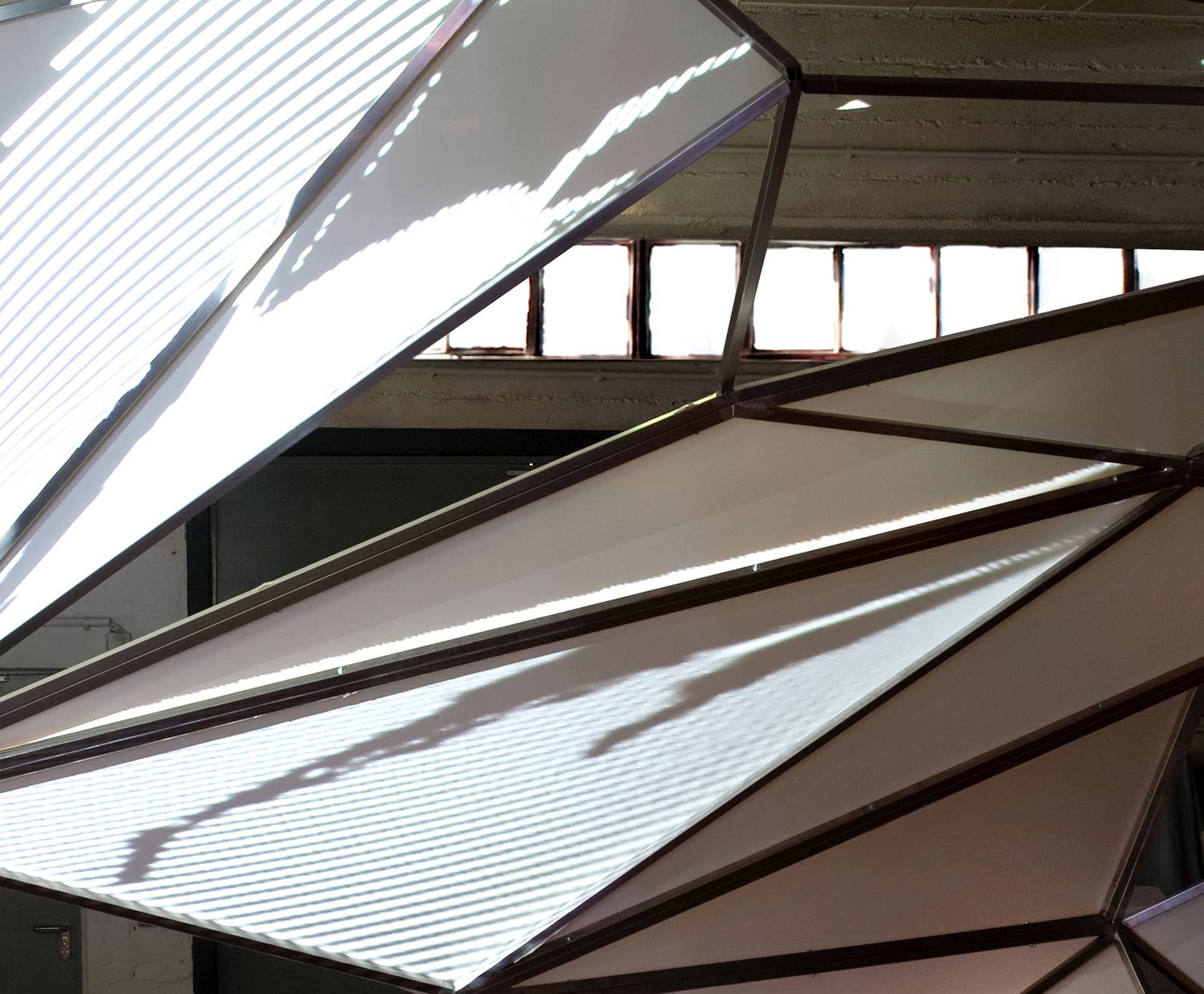 In the adjoining lounge area, a suspended polygonal mesh structure extended the sculptural language. Projection and light transformed it into a floating screen. At the center stood a life-sized horse sculpture – partially covered in sharp-edged white triangles – as a surreal hybrid of nature, fiction, and digital abstraction.