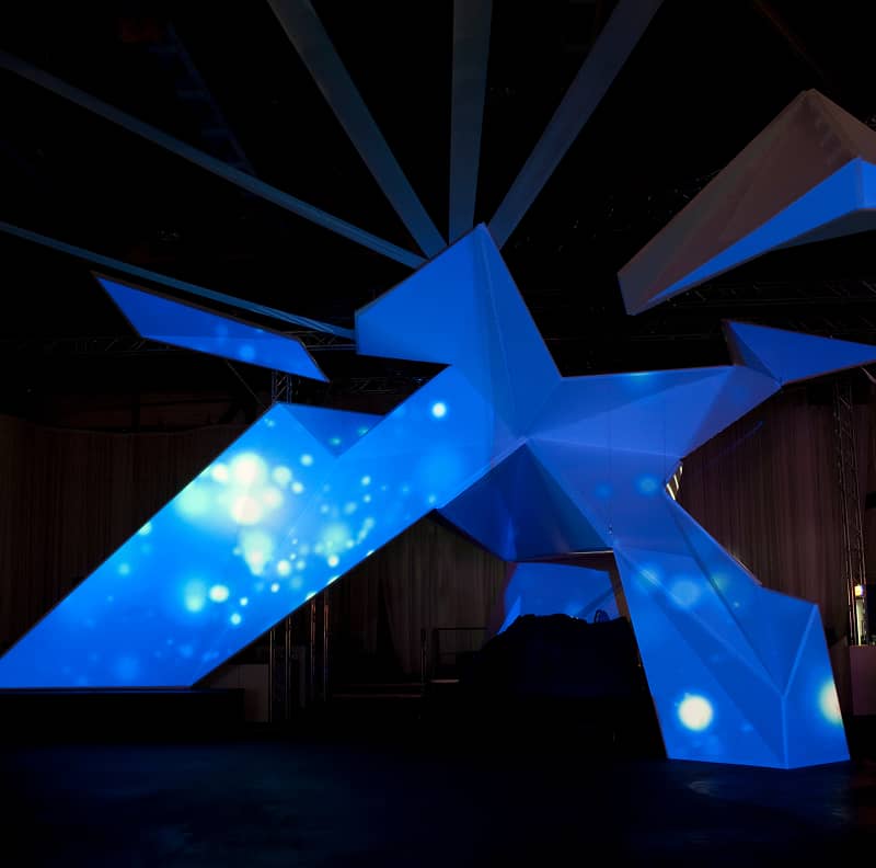At the heart of the exhibition stood a monumental 12-meter-high polygonal sculpture, resting on three legs and fully walkable. Its angular surfaces served as a projection canvas for a custom-developed video mapping that played with motion, rhythm, and spatial perception. Inside the structure, an integrated lighting choreography created shifting layers of atmosphere and depth.